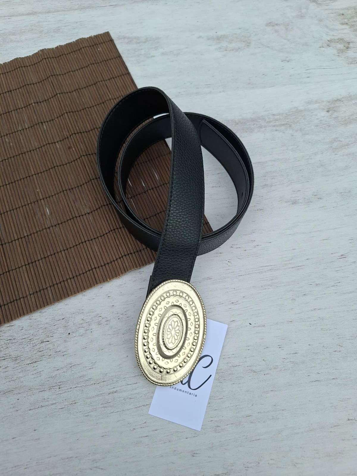 Cinto de eco cuero con hebilla chapon ovalada de color plateada
