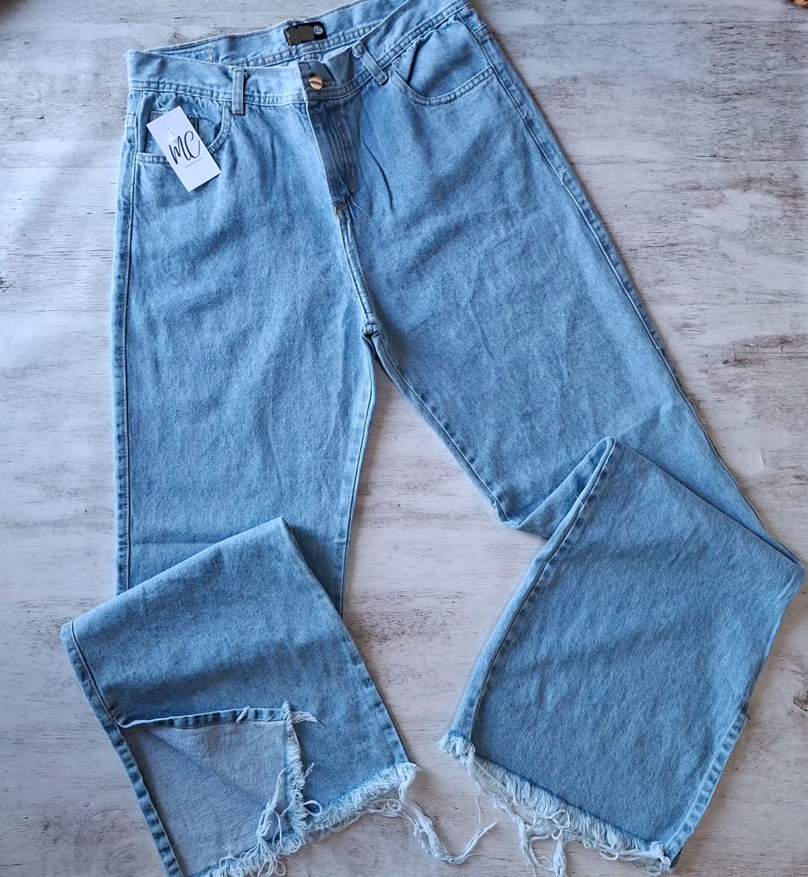 Jean wide leg rigido con tajo y deflecado celeste nevado